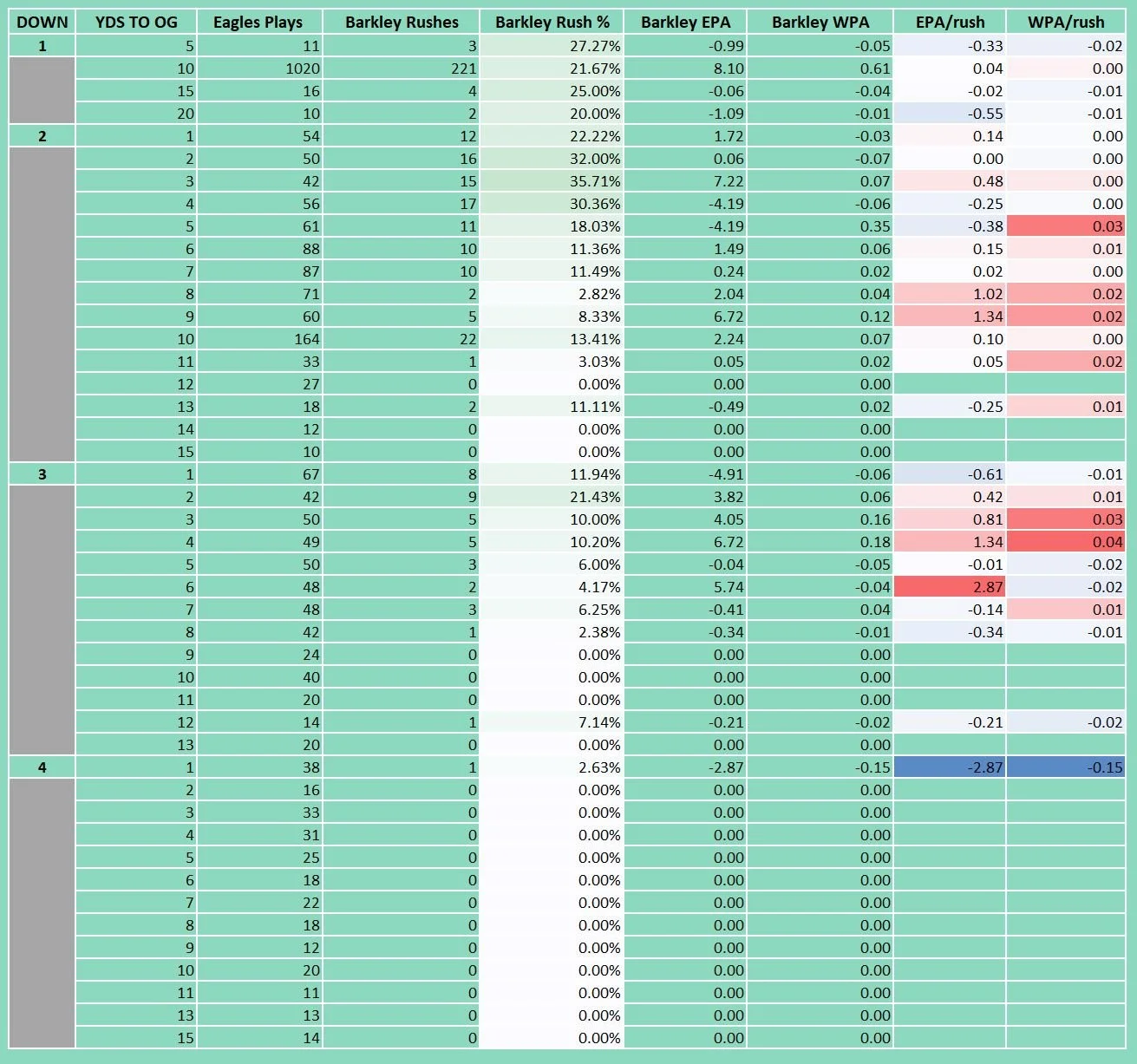 In terms of effectiveness, Barkley’s EPA/rush and WPA/rush are highest on 2nd down between 3 and 9 yards to go and 3rd down between 2 and 6 yards to go.