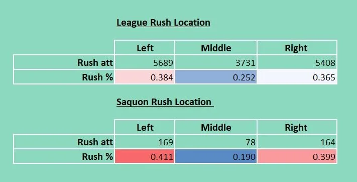 As evident from Table 1a and Table 1b below, Saquon runs the ball to the outside far more often than the league does on average. He’s an explosive player and the Eagles look to get him in space to create chunk plays.