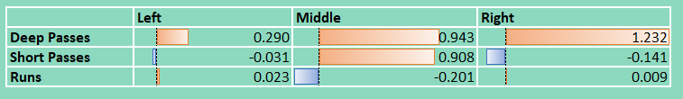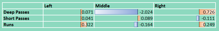 As seen in Table 1 below, the 49ers do a great job defending three of the nine zones, but struggle to defend three of the nine zones. Deep passes down the middle have been largely unsuccessful against them, resulting in a sizeable loss of more than two expected points per play on average. Short passes to the right and runs up the middle have also been negative plays against the 49ers. On the other hand, opposing offenses have had success against the 49ers when passing deep to the right and when running to the outside.