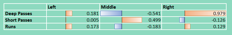 Taking the average of the Chiefs’ offensive epas and the 49ers’ defensive epas, we end up with Table 3—the matchup. Here, the Chiefs have two zones that they should be targeting frequently: deep passes to the right and short passes down the middle. They are also projected to succeed when passing deep to the left and running to the outside. Deep passes down the middle are a risky proposition against the 49ers’ secondary and runs up the middle will be difficult to rely on.