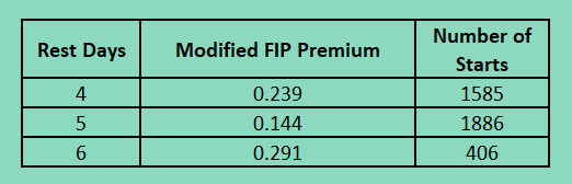 Every 10-point deviation in wOBA that the opponent generated above or below the league's average wOBA of 0.316, resulted in a corresponding 0.32767 decrease or increase in FIP, thereby establishing the "Modified FIP." I compared each starting pitcher's Modified FIP in a particular game against his season-average FIP, thereby generating the final "Modified FIP premium." I then grouped league-wide Modified FIP premiums based on the number of rest days before a start.