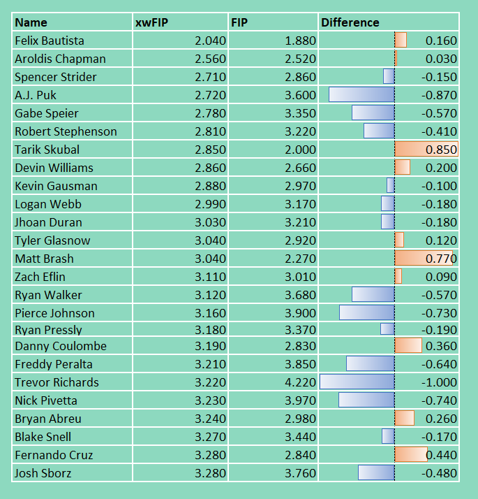 Assessing the 25 pitchers with the lowest xwFIP in 2023, listed in Table 4 below, we see that Felix Bautista still reigns supreme among all pitchers with at least 50 innings pitched in 2023, boasting a minuscule xwFIP of 2.04.