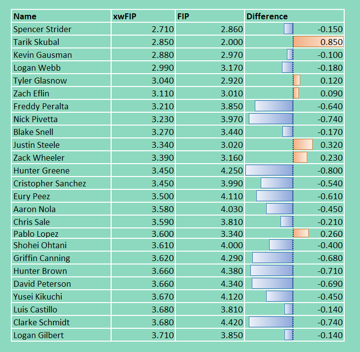When evaluating the 25 starting pitchers with the lowest xwFIP in 2023, we see that Spencer Strider, Tarik Skubal, Kevin Gausman, and Logan Webb are in the elite tier, with an xwFIP less than 3.00. Starters Tyler Glasnow, Zach Eflin, Freddy Peralta, Nick Pivetta, and Blake Snell also posted outstanding xwFIPs under 3.30.