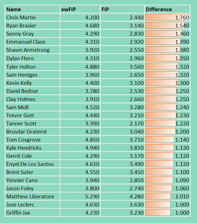 On the other hand, relievers Chris Martin and Ryan Brasier are joined by starter Sonny Gray and closer Emmanuel Clase as the pitchers who were quite lucky in 2023, limiting damage despite hard contact and managing to keep more than their fair share of flyballs in the ballpark.