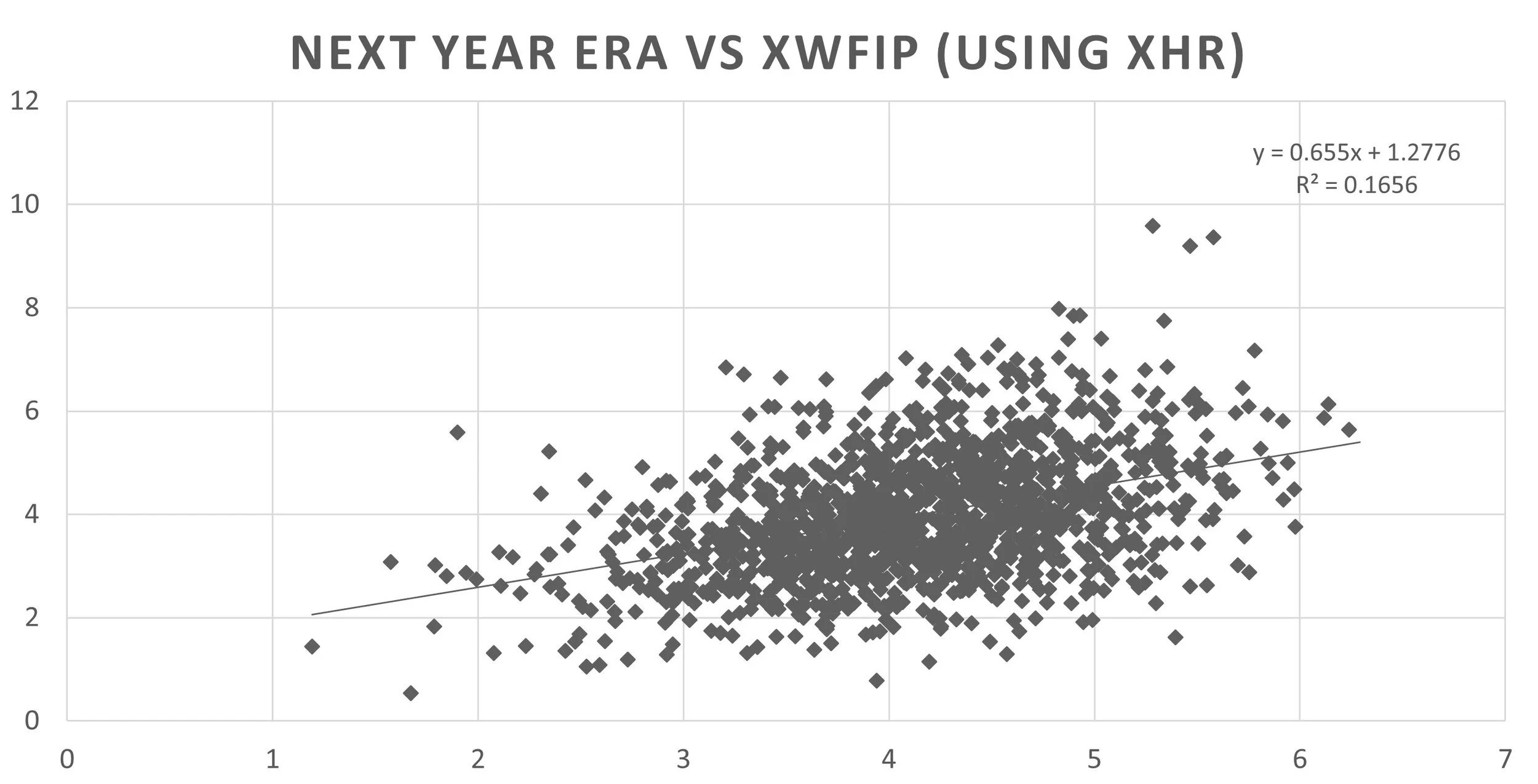Figure 1: Next Year ERA (y-axis) vs. xwFIP (x-axis), using xHR, for the 1466 pitchers with at least 50 innings pitched in back-to-back seasons since 2015
