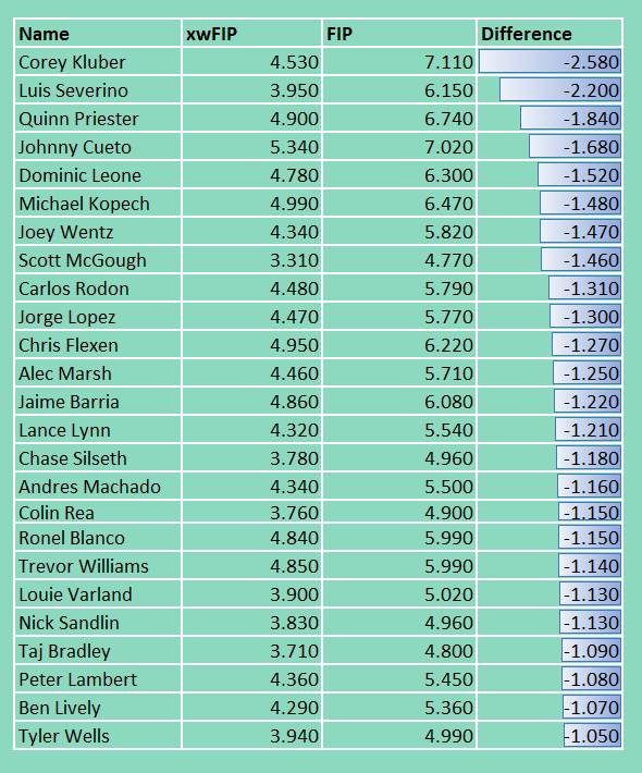 Looking at Table 2, which lists the 25 pitchers who benefit the most from the use of xwFIP in 2023, we see that veterans Corey Kluber, Luis Severino, Johnny Cueto, and Carlos Rodon were quite unlucky in 2023. Based on the quality of contact they generated and using the league-average HR/FB rate in xwFIP, both Severino and Rodon can be expected to significantly reduce their ERAs in 2024. Kluber and Cueto are currently free agents.