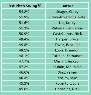 Notable hitters who aim to attack first pitches include Corey Seager, Nick Castellanos, Bryce Harper, Fernando Tatis Jr., Jackson Merrill, Mauricio Dubón, and Yainer Diaz.