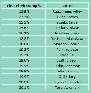 Table 1 outlines the 15 batters with the lowest first pitch swing percentage in the last two seasons. For context, the average first pitch swing rate over the past two seasons has been 33.3%.