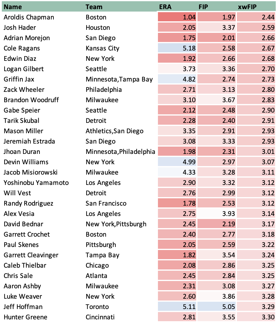 As we can see, Chapman’s 2.44 xwFIP is followed by Astros closer Josh Hader, Padres setup man Adrian Morejon, Royals ace Cole Ragans, and Mets closer Edwin Diaz in the top 5.