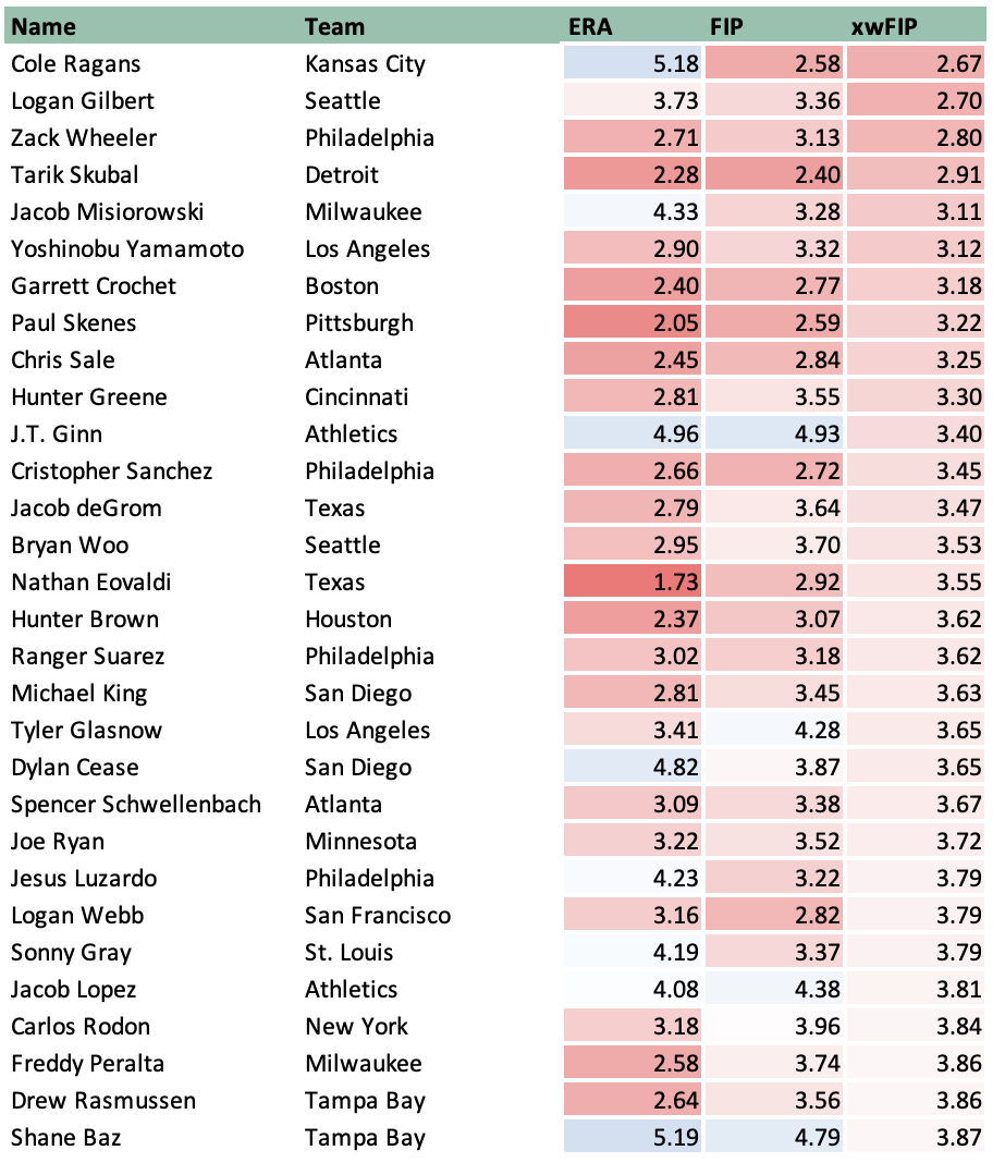 Ragans, Griffin Jax, Devin Williams, and Jeff Hoffman have been the unluckiest pitchers in the top 30, each with an ERA at least 1.8 runs worse than his xwFIP.